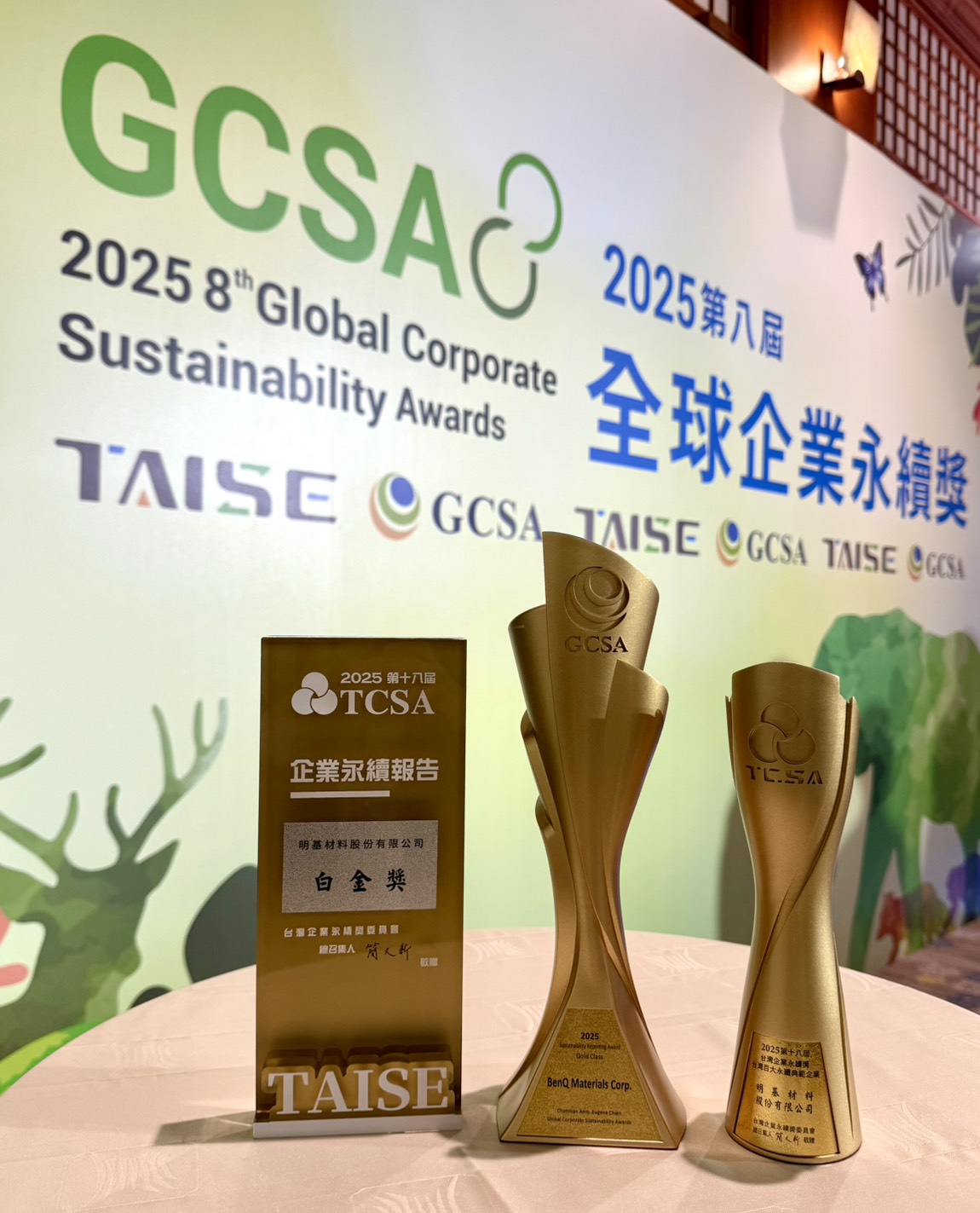 明基材料(BenQ Materials)於 2025 年第十八屆由台灣永續能源研究基金會(TAISE)主辦的 TCSA 台灣企業永續獎中,再度於永續綜合績效與永續報告兩大領域獲得肯定,並入選台灣百大永續典範企業。今年英文版永續報告亦於全球企業永續獎(GCSA)中首次取得 Gold Class 最高榮譽,創下公司歷年最佳戰績,展現長期累積的永續管理成果。